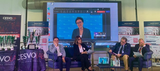 A destra: Maria Teresa Bellucci - Viceministro del Lavoro e delle Politiche Sociali in collegamento con Salvatore Mazzone - Sindaco Pietrelcina, Annamaria Baccarelli - Vicedirettrice RAI Parlamento, Ivan Nissoli - Presidente IID e Raffaele Amore - Presidente CESVOLAB