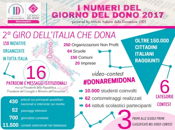 Nel 2017 infatti tutte le manifestazioni e gli eventi organizzati da IID – culminati con la presentazione del Giorno del Dono al Santo Padre Papa Francesco e con la premiazione dei vincitori dei contest #DonareMiDona - hanno assicurato ai Partner/Sponsor una rilevante visibilità, in particolar modo, sui social network, anche grazie alla presenza di hashtag dedicati e di una grande campagna di media marketing (oltre 430 gli articoli usciti sui principali quotidiani nazionali e 52 i passaggi in televisione. Più di 150 eventi in tutta Italia hanno composto il «2° Giro dell'Italia che Dona», oltre 150.000 persone sono state coinvolte nelle due settimane del dono e circa 10.000 persone hanno votato on line per i contest #DonareMiDona).