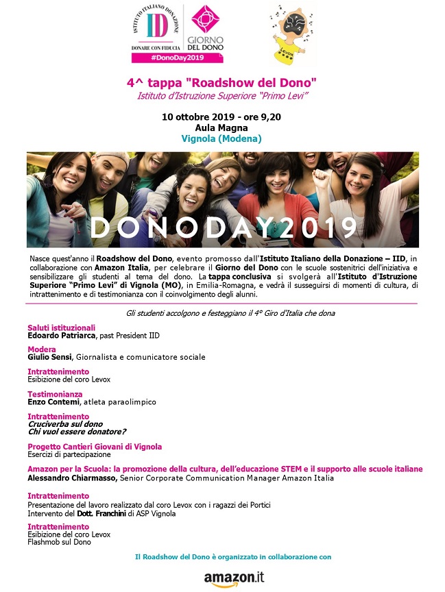 Nasce quest'anno il Roadshow del Dono, evento promosso dall'Istituto Italiano della Donazione – IID, in collaborazione con Amazon Italia, per celebrare il Giorno del Dono con le scuole sostenitrici dell'iniziativa e sensibilizzare gli studenti al tema del dono. La tappa conclusiva si svolgerà all'Istituto d'Istruzione Superiore “Primo Levi” di Vignola (MO), in Emilia-Romagna, e vedrà il susseguirsi di momenti di cultura, di intrattenimento e di testimonianza con il coinvolgimento degli alunni.