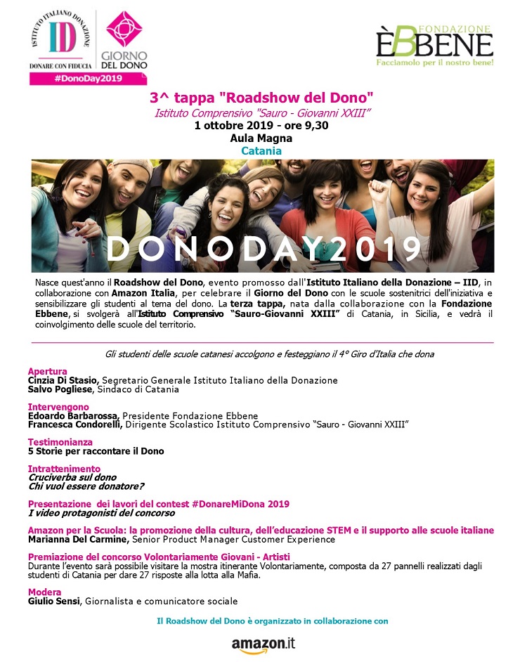 Nasce quest'anno il Roadshow del Dono, evento promosso dall'Istituto Italiano della Donazione – IID, in collaborazione con Amazon Italia, per celebrare il Giorno del Dono con le scuole sostenitrici dell'iniziativa e sensibilizzare gli studenti al tema del dono. La terza tappa, nata dalla collaborazione con la Fondazione Ebbene si svolgerà all'Istituto Comprensivo “Sauro – Giovanni XXIII” di Catania, in Sicilia, e vedrà il coinvolgimento di scuole del territorio.