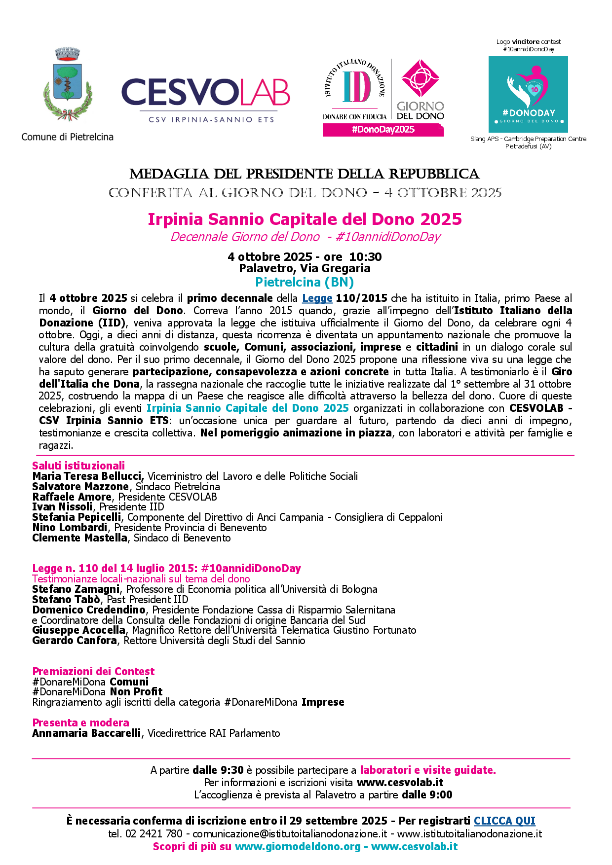 Il 4 ottobre 2025 si celebra il primo decennale della Legge 110/2015 che ha istituito in Italia, primo Paese al mondo, il Giorno del Dono. Correva l'anno 2015 quando, grazie all'impegno dell'Istituto Italiano della Donazione (IID), veniva approvata la legge che istituiva ufficialmente il Giorno del Dono, da celebrare ogni 4 ottobre. Oggi, a dieci anni di distanza, questa ricorrenza è diventata un appuntamento nazionale che promuove la cultura della gratuità coinvolgendo scuole, Comuni, associazioni, imprese e cittadini in un dialogo corale sul valore del dono. Per il suo primo decennale, il Giorno del Dono 2025 propone una riflessione viva su una legge che ha saputo generare partecipazione, consapevolezza e azioni concrete in tutta Italia. A testimoniarlo è il Giro dell'Italia che Dona, la rassegna nazionale che raccoglie tutte le iniziative realizzate dal 1° settembre al 31 ottobre 2025, costruendo la mappa di un Paese che reagisce alle difficoltà attraverso la bellezza del dono. Cuore di queste celebrazioni, gli eventi Irpinia Sannio Capitale del Dono 2025 organizzati in collaborazione con CESVOLAB - CSV Irpinia Sannio ETS: un'occasione unica per guardare al futuro, partendo da dieci anni di impegno, testimonianze e crescita collettiva.
