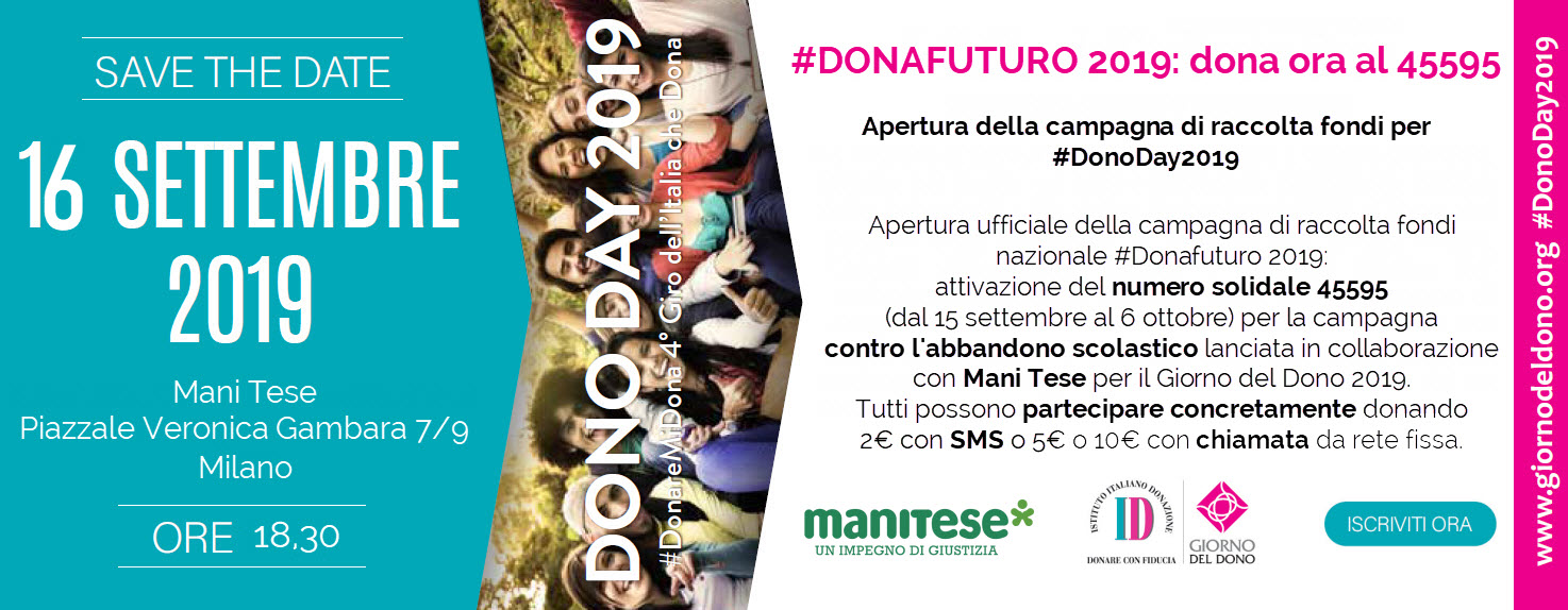 Apertura ufficiale della campagna di raccolta fondi nazionale #Donafuturo 2019: attivazione del numero solidale 45595 (dal 15 settembre al 6 ottobre) per la campagna contro l'abbandono scolastico lanciata in collaborazione con Mani Tese per il Giorno del Dono 2019. Tutti possono partecipare concretamente al #DonoDay2019 donando 2€ con SMS o 5€ o 10€ con chiamata da rete fissa.