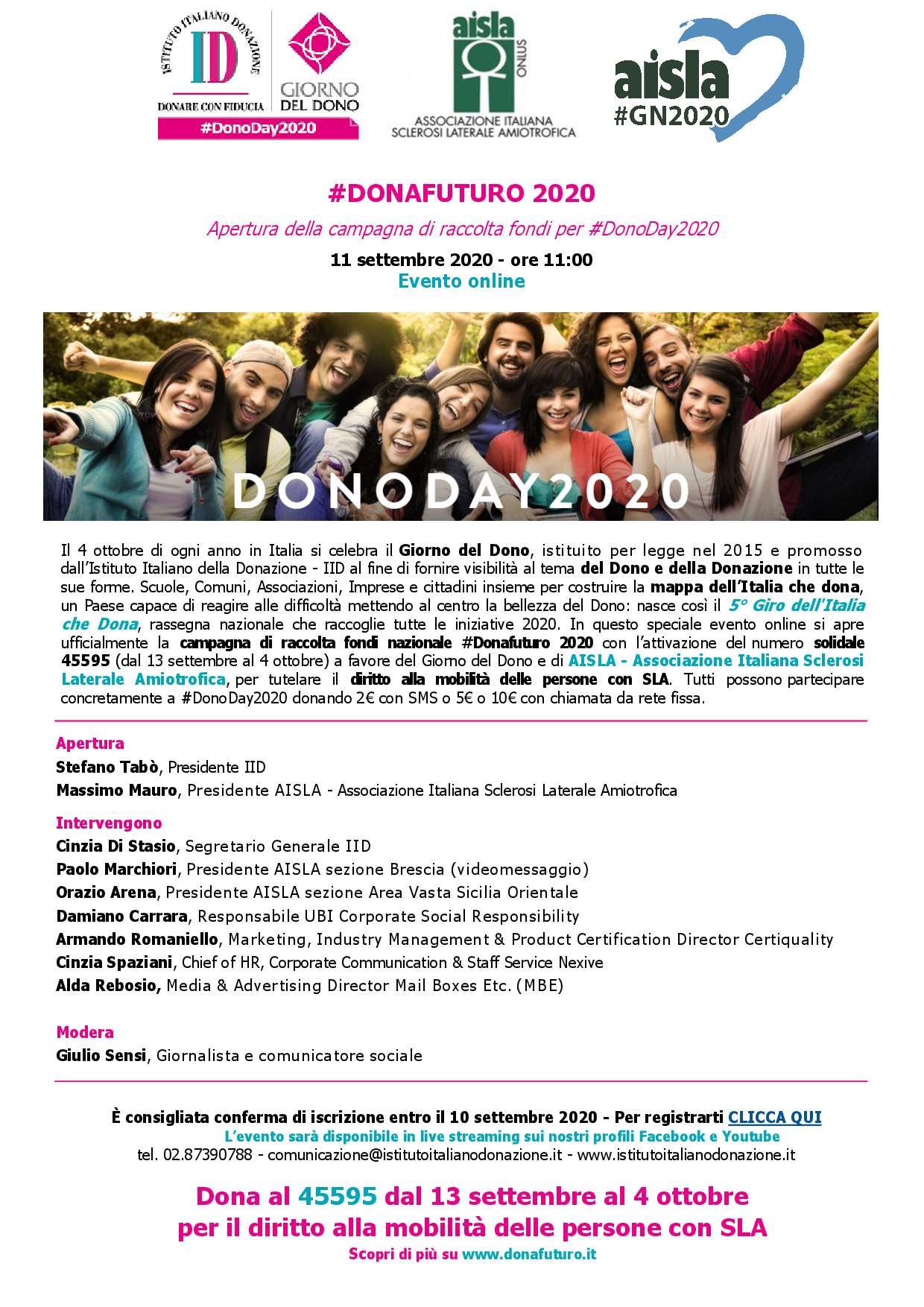 Il 4 ottobre di ogni anno in Italia si celebra il Giorno del Dono, istituito per legge nel 2015 e promosso dall'Istituto Italiano della Donazione - IID al fine di fornire visibilità al tema del Dono e della Donazione in tutte le sue forme. Scuole, Comuni, Associazioni, Imprese e cittadini insieme per costruire la mappa dell'Italia che dona, un Paese capace di reagire alle difficoltà mettendo al centro la bellezza del Dono: nasce così il 5° Giro dell'Italia che Dona, rassegna nazionale che raccoglie tutte le iniziative 2020. In questo speciale evento online si apre ufficialmente la campagna di raccolta fondi nazionale #Donafuturo 2020 con l'attivazione del numero solidale 45595 (dal 13 settembre al 4 ottobre) a favore del Giorno del Dono e di AISLA - Associazione Italiana Sclerosi Laterale Amiotrofica, per tutelare il diritto alla mobilità delle persone con SLA. Tutti possono partecipare concretamente a #DonoDay2020 donando 2€ con SMS o 5€ o 10€ con chiamata da rete fissa.