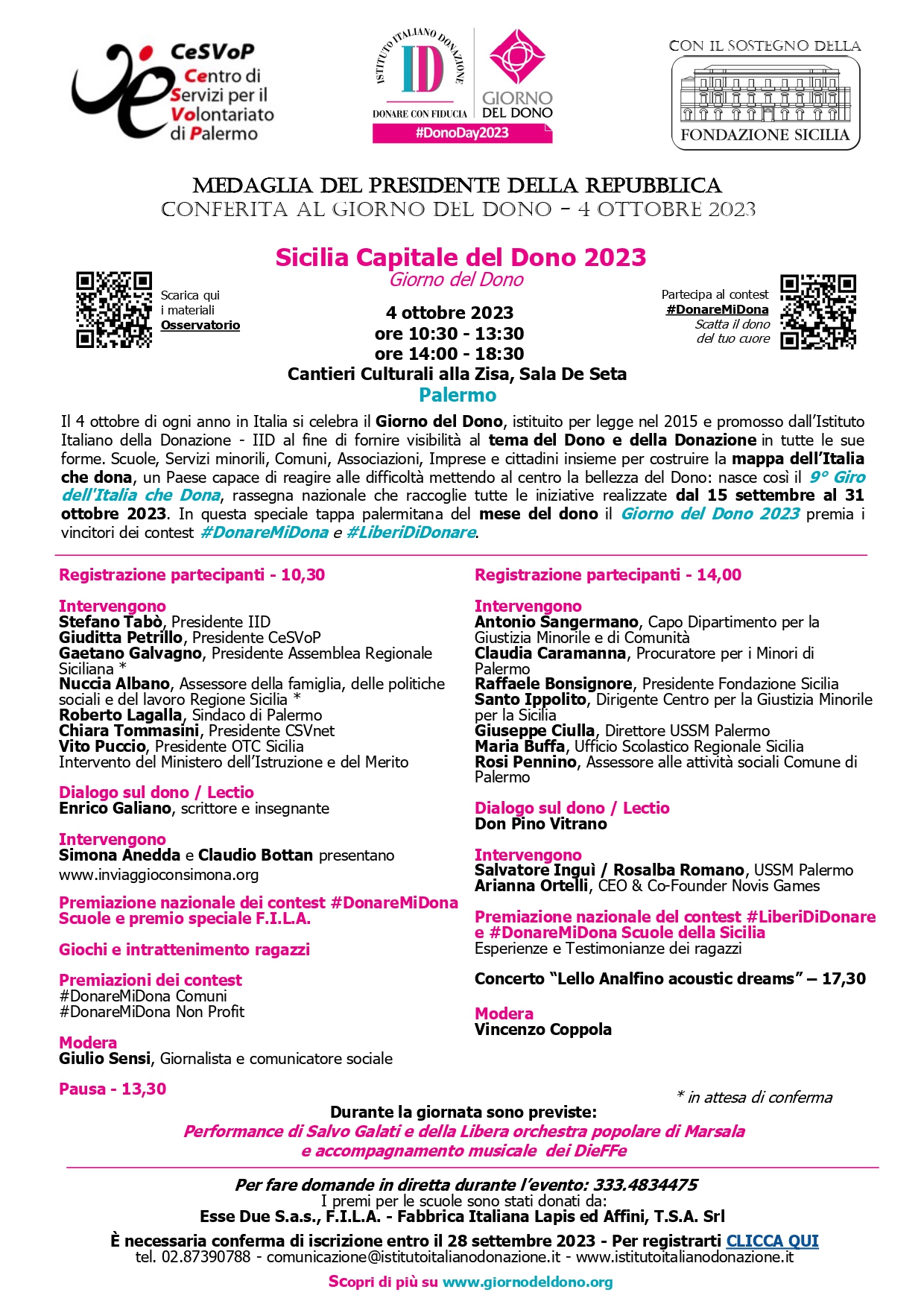 Il 4 ottobre di ogni anno in Italia si celebra il Giorno del Dono, istituito per legge nel 2015 e promosso dall'Istituto Italiano della Donazione - IID al fine di fornire visibilità al tema del Dono e della Donazione in tutte le sue forme. Scuole, Servizi minorili, Comuni, Associazioni, Imprese e cittadini insieme per costruire la mappa dell'Italia che dona, un Paese capace di reagire alle difficoltà mettendo al centro la bellezza del Dono: nasce così il 9° Giro dell'Italia che Dona, rassegna nazionale che raccoglie tutte le iniziative realizzate dal 15 settembre al 31 ottobre 2023. In questa speciale tappa palermitana del mese del dono il Giorno del Dono 2023 premia i vincitori dei contest #DonareMiDona e #LiberiDiDonare.