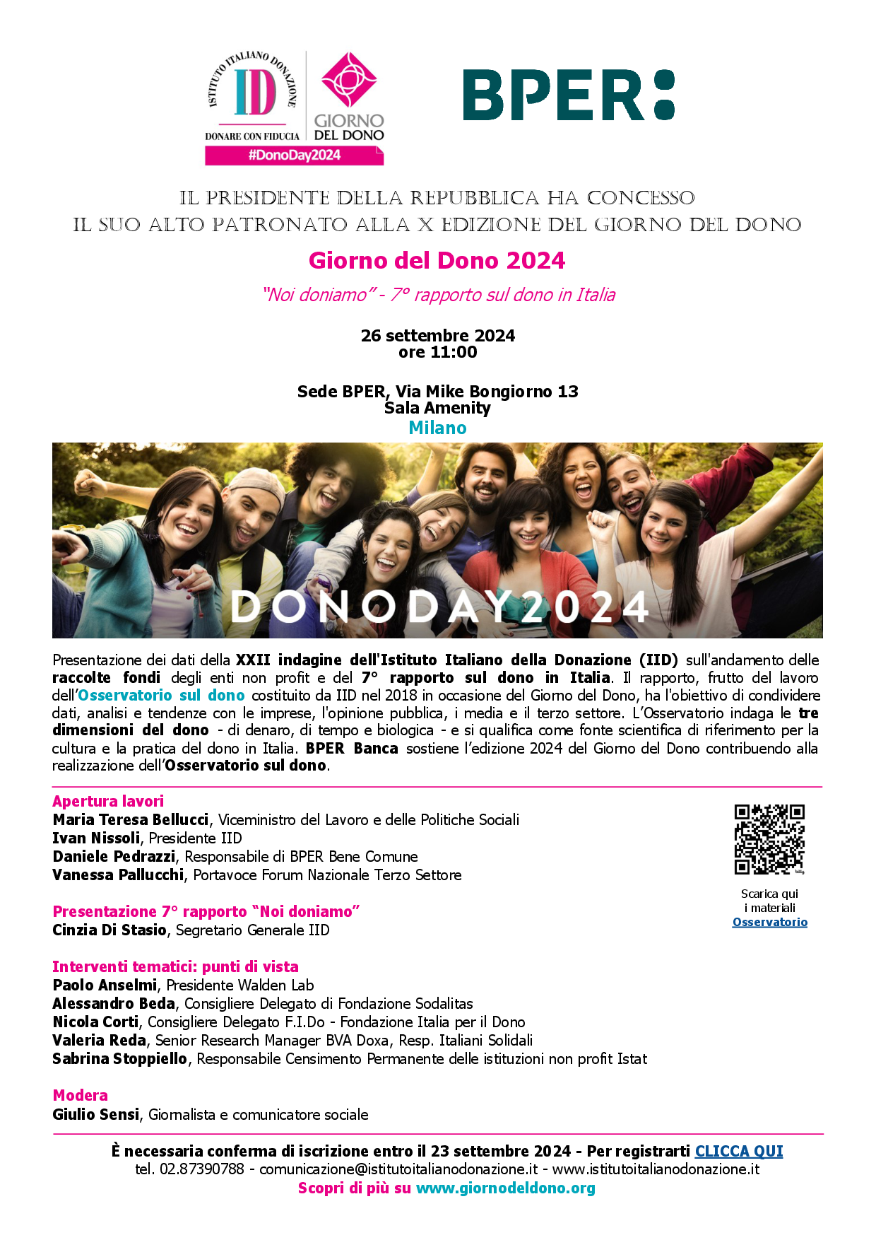Presentazione dei dati della XXII indagine dell'Istituto Italiano della Donazione (IID) sull'andamento delle raccolte fondi degli enti non profit in Italia e del 7° rapporto sul dono in Italia. Il rapporto, frutto del lavoro dell'Osservatorio sul dono costituito da IID nel 2018 in occasione del Giorno del Dono, ha l'obiettivo di condividere dati, analisi e tendenze con le imprese, l'opinione pubblica, i media e il terzo settore. L'Osservatorio indaga le tre dimensioni del dono - di denaro, di tempo e biologica - e si qualifica come fonte scientifica di riferimento per la cultura e la pratica del dono in Italia. BPER Banca sostiene l'edizione 2024 del Giorno del Dono contribuendo alla realizzazione dell'Osservatorio sul dono