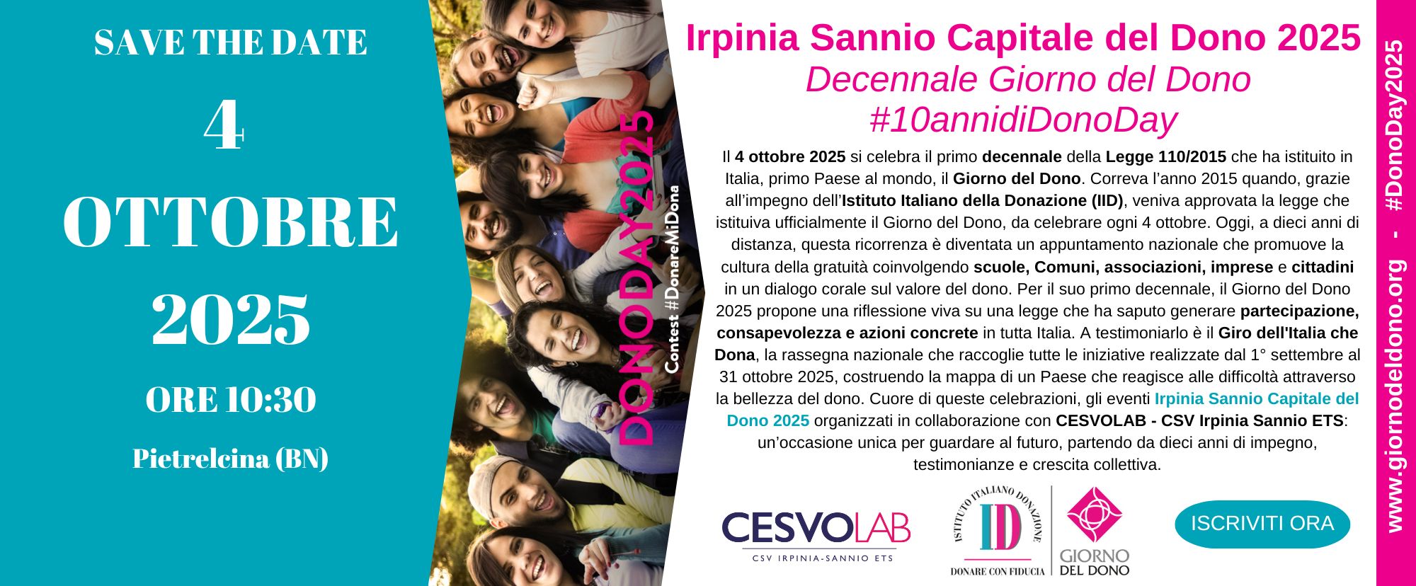 Il 4 ottobre 2025 si celebra il primo decennale della Legge 110/2015 che ha istituito in Italia, primo Paese al mondo, il Giorno del Dono. Correva l'anno 2015 quando, grazie all'impegno dell'Istituto Italiano della Donazione (IID), veniva approvata la legge che istituiva ufficialmente il Giorno del Dono, da celebrare ogni 4 ottobre. Oggi, a dieci anni di distanza, questa ricorrenza è diventata un appuntamento nazionale che promuove la cultura della gratuità coinvolgendo scuole, Comuni, associazioni, imprese e cittadini in un dialogo corale sul valore del dono. Per il suo primo decennale, il Giorno del Dono 2025 propone una riflessione viva su una legge che ha saputo generare partecipazione, consapevolezza e azioni concrete in tutta Italia. A testimoniarlo è il Giro dell'Italia che Dona, la rassegna nazionale che raccoglie tutte le iniziative realizzate dal 1° settembre al 31 ottobre 2025, costruendo la mappa di un Paese che reagisce alle difficoltà attraverso la bellezza del dono. Cuore di queste celebrazioni, gli eventi Irpinia Sannio Capitale del Dono 2025 organizzati in collaborazione con CESVOLAB - CSV Irpinia Sannio ETS: un'occasione unica per guardare al futuro, partendo da dieci anni di impegno, testimonianze e crescita collettiva.