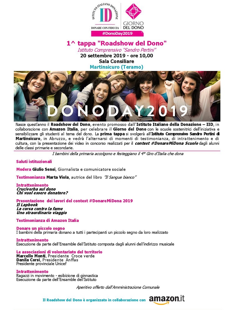 Nasce quest'anno il Roadshow del Dono, evento promosso dall'Istituto Italiano della Donazione – IID, in collaborazione con Amazon Italia, per celebrare il Giorno del Dono con le scuole sostenitrici dell'iniziativa e sensibilizzare gli studenti al tema del dono. La prima tappa si svolgerà all'Istituto Comprensivo Sandro Pertini di Martinsicuro (TE), in Abruzzo, e vedrà l'alternarsi di momenti di testimonianza, di intrattenimento e di cultura, con la presentazione dei video in concorso realizzati per il contest #DonareMiDona Scuole dagli alunni delle classi primarie e secondarie.