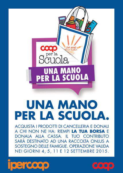 Come ormai accade da qualche anno, COOP Lombardia insieme ad alcune Organizzazioni Non Profit selezionate ha dato ai propri acquirenti la possibilità di regalare alle famiglie più bisognose prodotti per la scuola. Nei primi due week-end di settembre i clienti ed i soci COOP hanno incontrato e concretamente aiutato le Organizzazioni Non Profit presenti nei punti vendita per la raccolta di materiale scolastico.