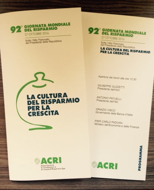 Si è tenuta oggi, nella prestigiosa cornice di Palazzo della Cancelleria a Roma, la 92ª Giornata Mondiale del Risparmio organizzata come ogni anno dall'Acri sotto l'Alto Patronato del Presidente della Repubblica. All'evento dal titolo “La cultura del risparmio per la crescita” sono intervenuti Pier Carlo Padoan, ministro dell'Economia e delle Finanze; Ignazio Visco, governatore della Banca d'Italia; Giuseppe Guzzetti, Presidente dell'Acri; Antonio Patuelli, Presidente dell'Abi. In questa occasione sono stati presentati anche i risultati dell'indagine su “Gli Italiani e il Risparmio”, realizzata da Ipsos per Acri e giunta alla sua sedicesima edizione.