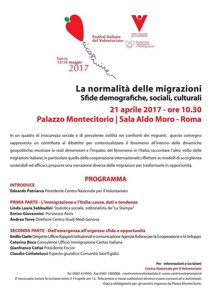 Provare a guardare il fenomeno migratorio con lenti “normali” e come una, faticosa e da costruire, opportunità. Il secondo evento di avvicinamento al Festival del Volontariato in programma a Lucca dal 12 al 14 maggio, il Centro Nazionale per il Volontariato e la Fondazione Volontariato e Partecipazione hanno voluto dedicarlo ad uno dei temi più urgenti per il Paese: le migrazioni. “La normalità delle migrazioni. Sfide demografiche, sociali, culturali” è il titolo del convegno che si terrà a Roma il 21 aprile a Montecitorio nella Sala Aldo Moro.