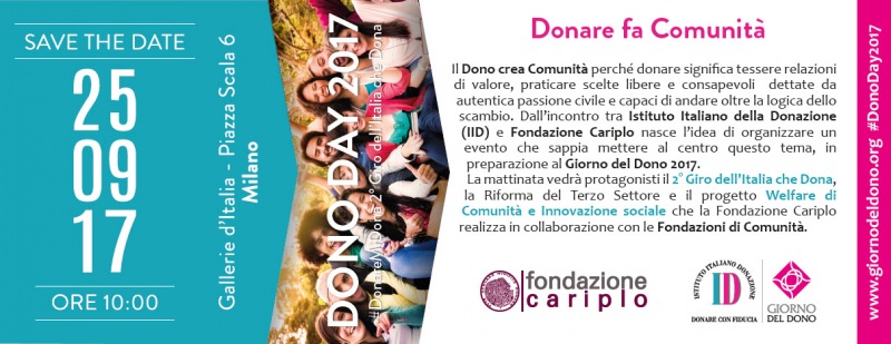 Il Dono crea Comunità perché donare significa tessere relazioni di valore, praticare scelte libere e consapevoli dettate da autentica passione civile e capaci di andare oltre la logica dello scambio. Dall'incontro tra Istituto Italiano della Donazione (IID) e Fondazione Cariplo nasce l'idea di organizzare un evento che sappia mettere al centro questo tema, in preparazione al Giorno del Dono 2017.