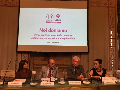 Il Report "Noi doniamo - Le pratiche di donazione in Italia" è stato presentato oggi (3 ottobre) nella Sala Zuccari del Senato insieme alla consueta Indagine sulle raccolte fondi del non profitcurata da IID. A presentare e discutere i dati sono stati il presidente IID e Senatore Edoardo Patriarca, il Segretario Generale IID Cinzia Di Stasio, la sociologa Paola Tronu, curatrice del rapporto, Ana Benavides, Vice Presidente International Commitee on Fundraising Organizations (ICFO), Valeria Reda, Responsabile monitoraggio Italiani Solidali DOXA, Giuseppe Marano, Responsabile Settore Emovigilanza e Settore HTA e monitoraggio best practices Centro Nazionale Sangue e la responsabile comunicazione del Centro Nazionale Trapianti Daniela Storani.