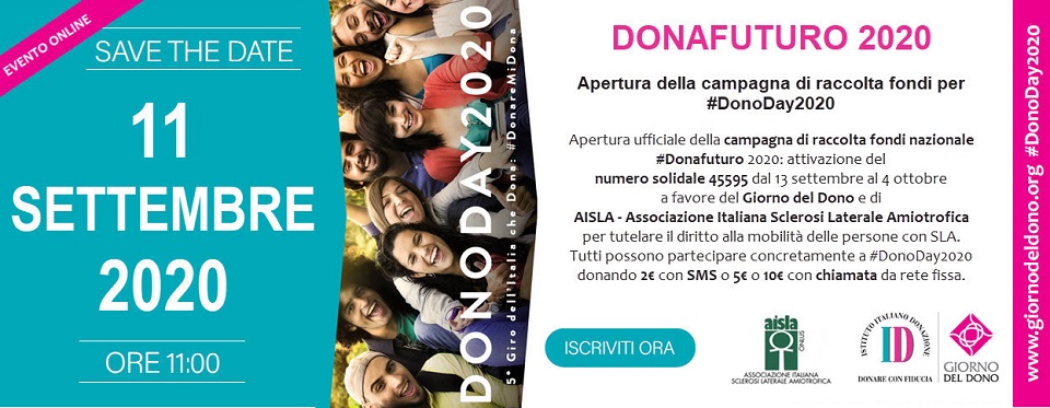 Milano, 9 settembre 2020 – È un evento esclusivamente online a dare il via quest'anno al Giorno del Dono previsto per legge il 4 ottobre: l'11 settembre l'Istituto Italiano della Donazione (IID) e AISLA - Associazione Italiana Sclerosi Laterale Amiotrofica si danno appuntamento in streaming per aprire la terza edizione della campagna nazionale di raccolta fondi#Donafuturo, il gesto concreto che tutti possono compiere per celebrare la ricorrenza del 4 ottobre.