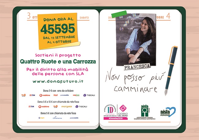 In Italia si stimano più di 6.000 persone affette da SLA - Sclerosi Laterale Amiotrofica e 2.000 nuovi casi ogni anno. La SLA è una malattia neurodegenerativa progressiva: blocca il corpo ma la mente non smette di viaggiare. Per tutelare il diritto alla mobilità delle persone con SLA è possibile sostenere dal 13 settembre al 4 ottobre il progetto “Quattro ruote e una carrozza” di AISLA donando al numero 45595 2 euro con un SMS da cellulare oppure 5 o 10 euro chiamando da rete fissa e partecipare così a #Donafuturo 2020.