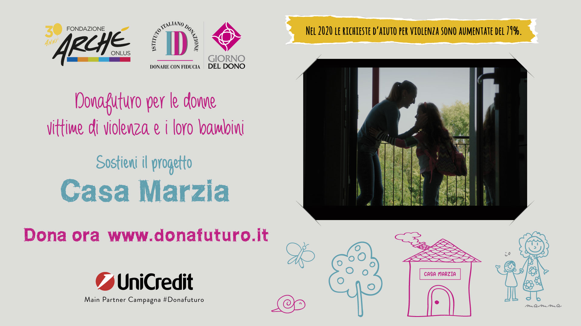 Arché, nel suo trentesimo anno di attività, forte dell'esperienza maturata nell'accoglienza e nell'assistenza domiciliare sia in Lombardia che in Lazio, vuole rispondere alle numerose richieste di aiuto di donne con bambini con disagio e vittime di violenza, che, a seguito della pandemia da Covid-19, sono cresciute notevolmente: basti pensare che il 1522, il numero verde anti violenza promosso dalla Presidenza del Consiglio dei Ministri, ha visto nel 2020 un incremento del 79,5% degli accessi rispetto al 2019.