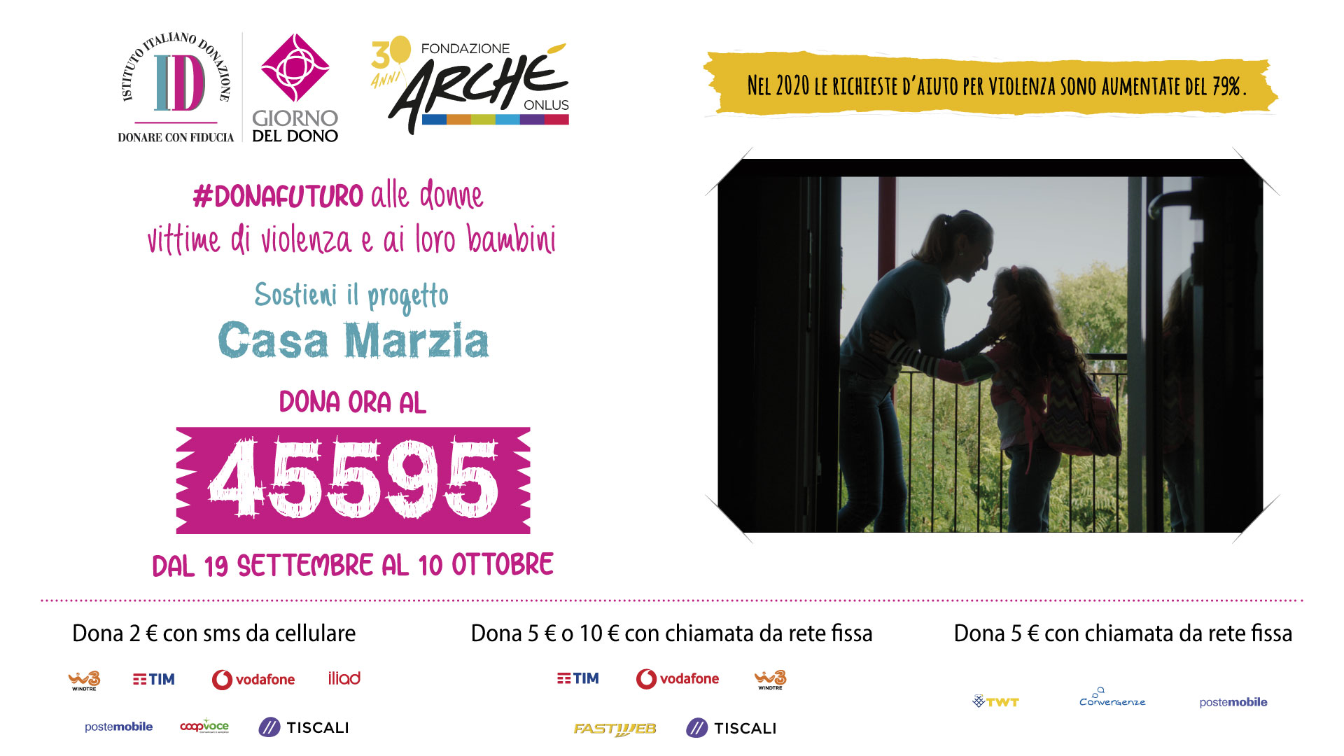 Roma, 20 settembre 2021 – In occasione del Giorno del Dono 2021, previsto per legge il 4 ottobre di ogni anno, l'Istituto Italiano della Donazione (IID) e Fondazione Arché lanciano la quarta edizione della campagna nazionale di raccolta fondi #Donafuturo dal titolo #Donafuturo 2021: Casa Marzia per le donne vittime di violenza e i loro bambini.