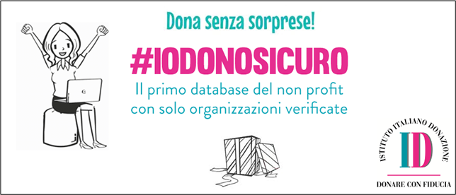 “Dona senza sorprese” è il titolo della campagna di informazione sulla donazione consapevole che permette di facilitare la scelta di un'organizzazione non profit a cui fare una donazione in sicurezza, evidenziando e promuovendo le realtà inserite in IO DONO SICURO, il primo database del non profit italiano composto da sole organizzazioni verificate, sicure e affidabili. La campagna si sviluppa online e sui canali social dell'Istituto Italiano della Donazione ed è rivolta a tutti coloro che vorrebbero donare ma non si fidano.