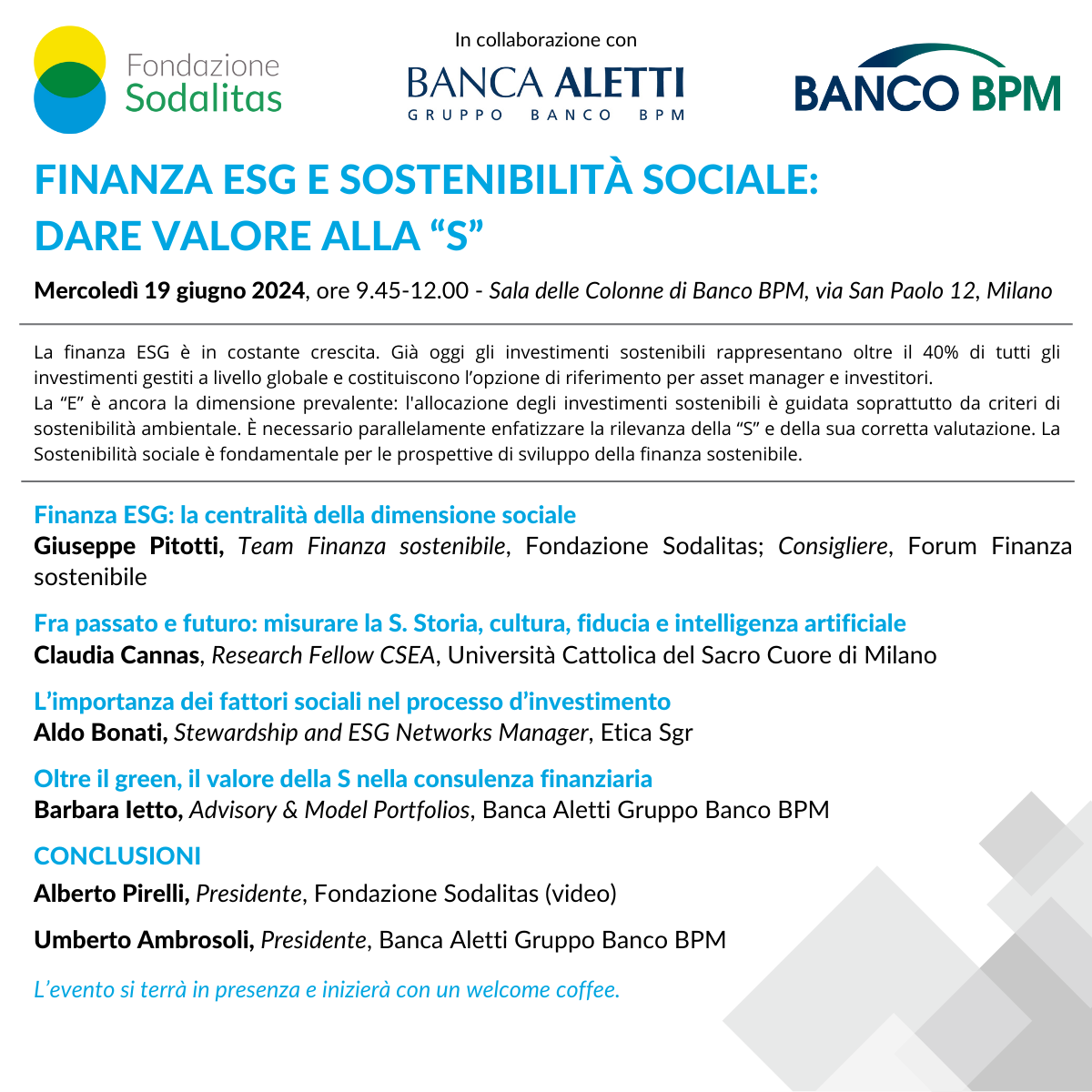 L'evento di Fondazione Sodalitas si terrà il prossimo 19 giugno 2024 dalle 9:45 alle 12 presso la Sala delle Colonne di Banco BPM, in via San Paolo, 12 a Milano.