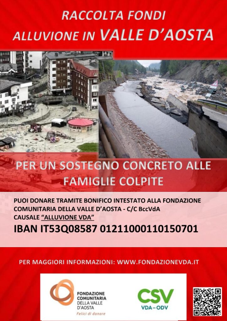 Per effettuare una donazione, è possibile utilizzare il codice IBAN IT53 Q 08587 01211 000110150701 su Banca BCC Valdostana, indicando come causale “Alluvione in Valle d'Aosta”.