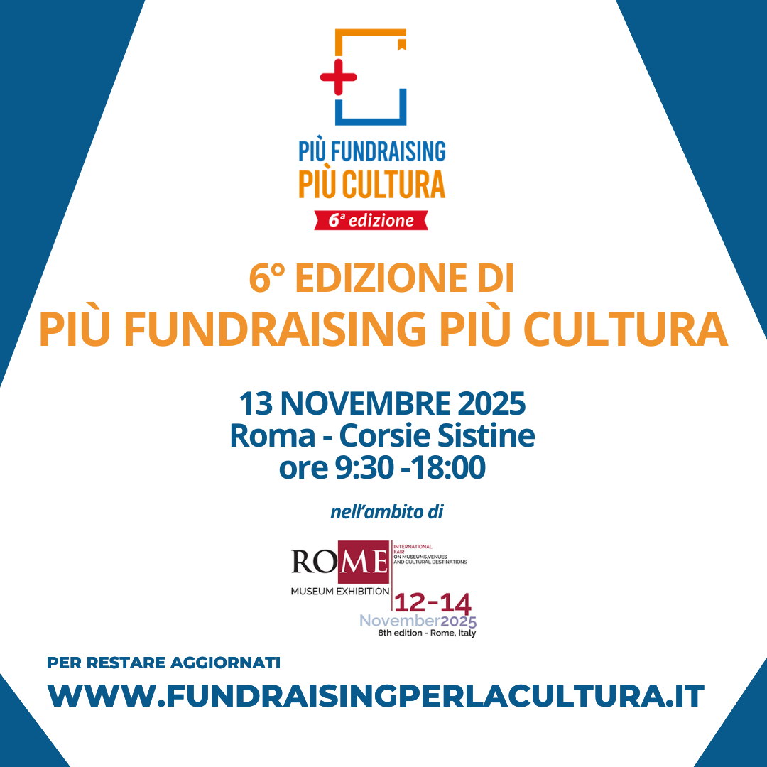 Più Fundraising Più Cultura, il più importante programma gratuito in Italia dedicato alla raccolta fondi in ambito culturale, promosso da Scuola di Fundraising di Roma, Patrimonio Cultura Società Benefit e Associazione Fundraising Lab, torna con il suo Main Event il 13 novembre 2025, dalle ore 9.30 alle ore 18.00, presso le Corsie Sistine - Borgo Santo Spirito, 1/2 - Roma