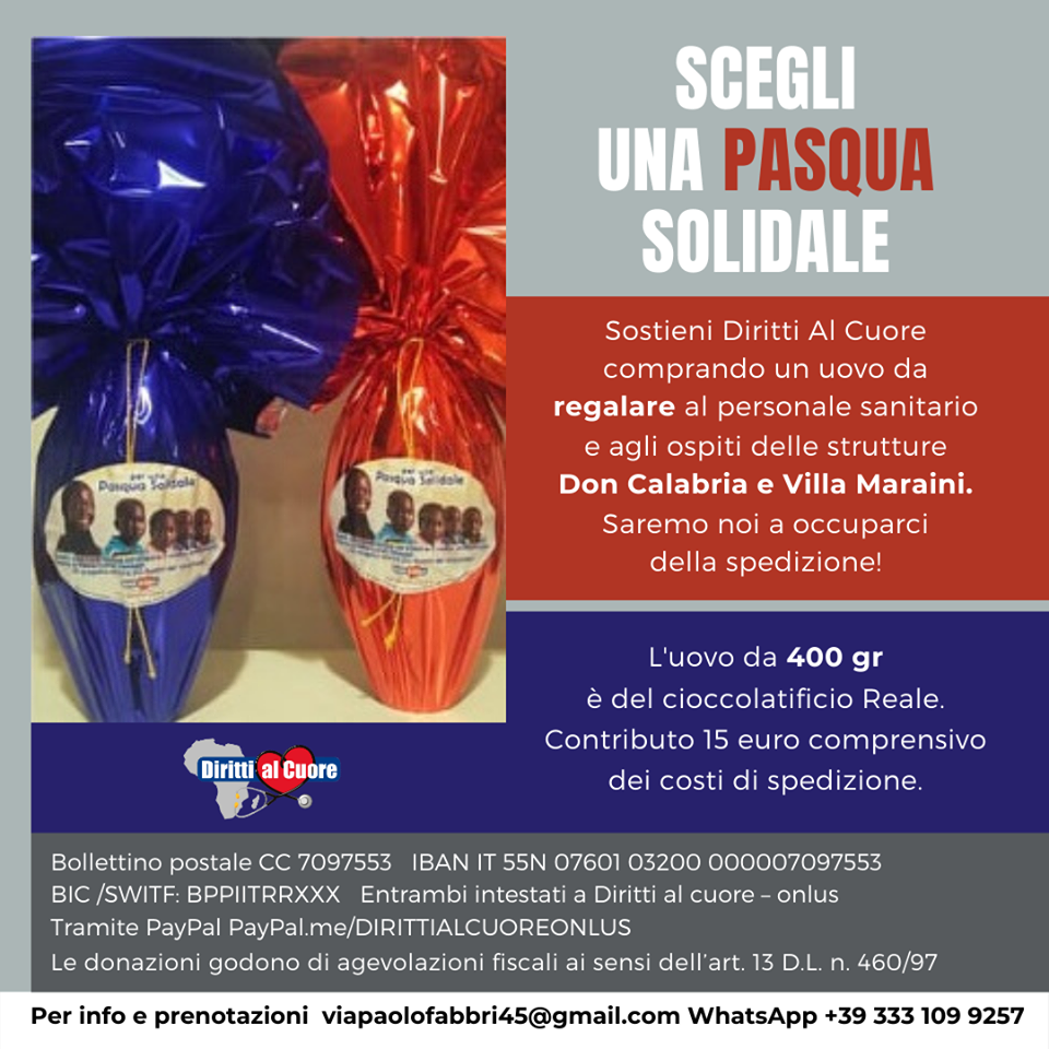 In questo periodo di difficoltà e di impossibilità di spostamenti le attività di Diritti al cuore stanno andando avanti, rimodulate nella forma ma non nella sostanza. In Senegal ad esempio è partita la campagna di prevenzione contro il Covid acquistando materiale sanitario da donare al personale sanitario e si sta facendo una campagna di sensibilizzazione sulle norme da seguire per evitare il contagio alla popolazione tramite i nostri promotori e le ragazze del progetto Fatou. Oggi come non mai, visto che non abbiamo la possibilità di organizzare eventi di raccolta fondi per noi fondamentali, la campagna pasquale di raccolta fondi tramite la vendita di Uova di Pasqua si terrà lo stesso ma regaleremo le uova acquistate dai nostri sostenitori al Don Calabria e a Villa Maraini.