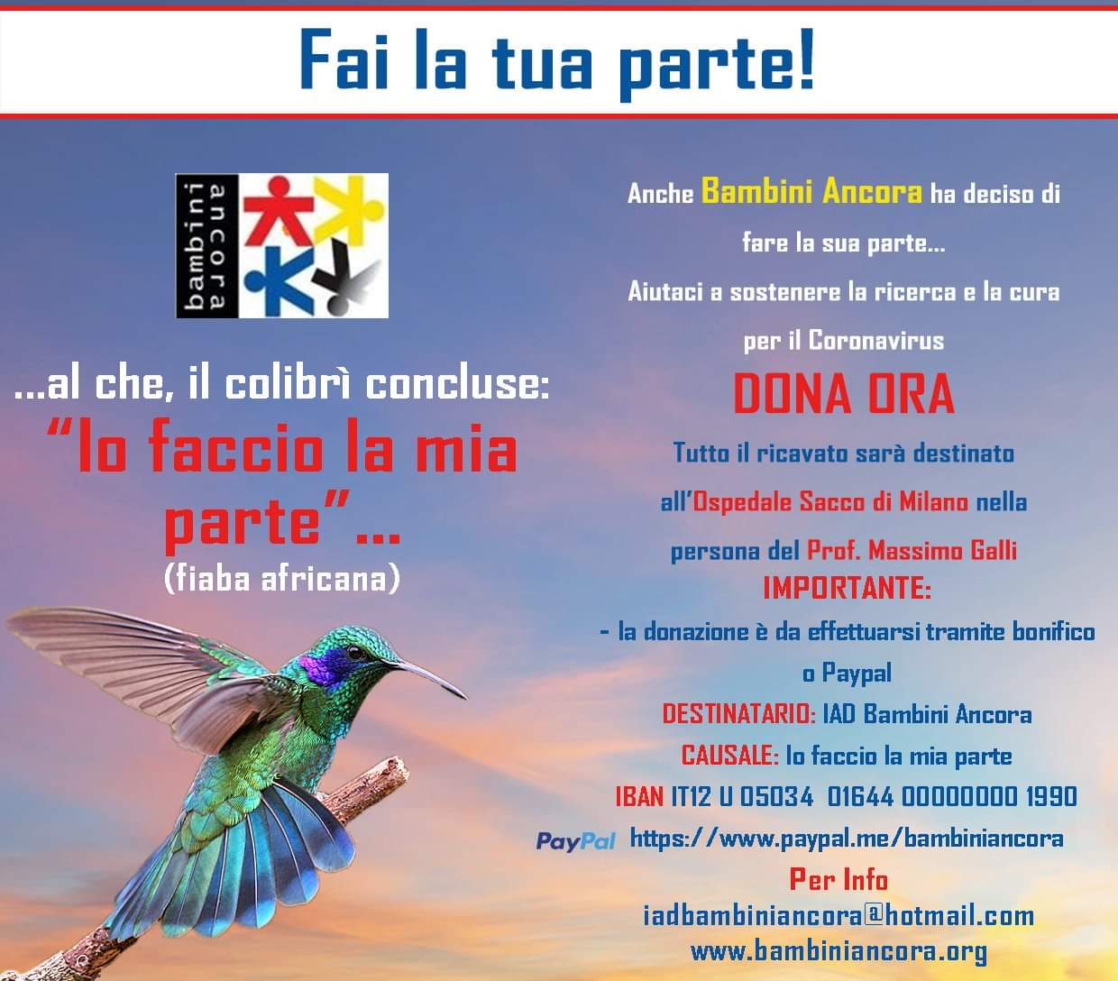Anche Bambini Ancora con l'iniziativa "Fai la tua parte" aderisce alla mobilitazione nazionale a favore degli ospedali lombardi. La raccolta dell'associazione sarà finalizzata ad un intervento concreto presso l'ospedale Sacco di Milano.