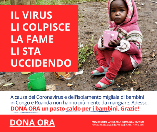 A causa del Coronavirus e dell'isolamento sociale migliaia di bambini in Congo e in Ruanda non hanno più niente da mangiare.