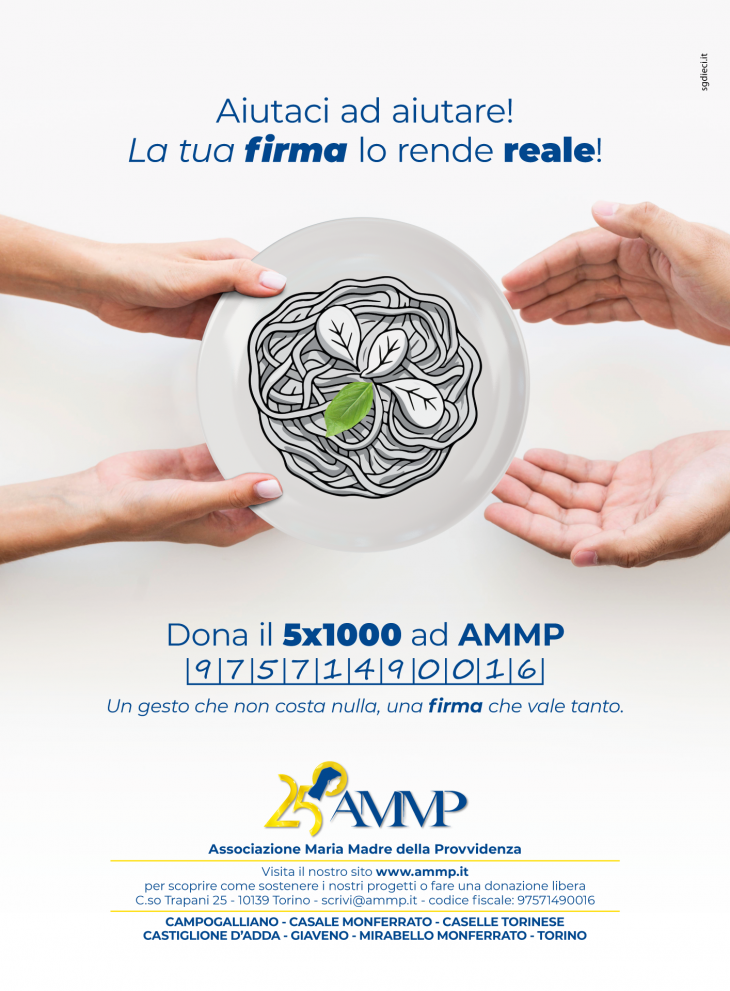 Quest'anno, “Associazione Maria Madre della Provvidenza” (AMMP) festeggerà i 25 anni di attività, essa è grata per esser riuscita ad abbattere molti muri di indifferenza in Italia e in diverse parti del mondo. di Con la stessa attenzione di sempre essi desiderano promuovere una lettura positiva di questi tempi difficili considerandoli importanti insegnanti per una crescita empatica nei confronti dei più bisognosi. L'AMMP afferma che qualsiasi esperienza, positiva o negativa che sia, può insegnarci qualcosa; se prima non lo avevano ancora sperimentato, adesso, chiunque può comprendere meglio cosa provano gli utenti “dell'Associazione Maria Madre della Provvidenza”, cosa significhi vivere nell'incertezza e nella precarietà, nella paura e nell'isolamento, nella rinuncia e nell'insoddisfazione. Diviene possibile reagire agli arresti forzati di questo tempo che appare sospeso compiendo dei passi nuovi, tanto metaforici quanto reali. I cambiamenti concreti che AMMP ha apportato nelle vite di tanti in tutti questi anni sono stati resi tali da ciascun individuo che ha deciso di fare un passo, più o meno ampio. Tanti piccoli passi di molte persone le hanno permesso di compiere questo cammino volto al sostegno di innumerevoli fratelli poveri e disperati. Il 5x1000 rappresenta un passo concreto e gratuito, che permette davvero di raggiungere mete tangibili e verificabili.