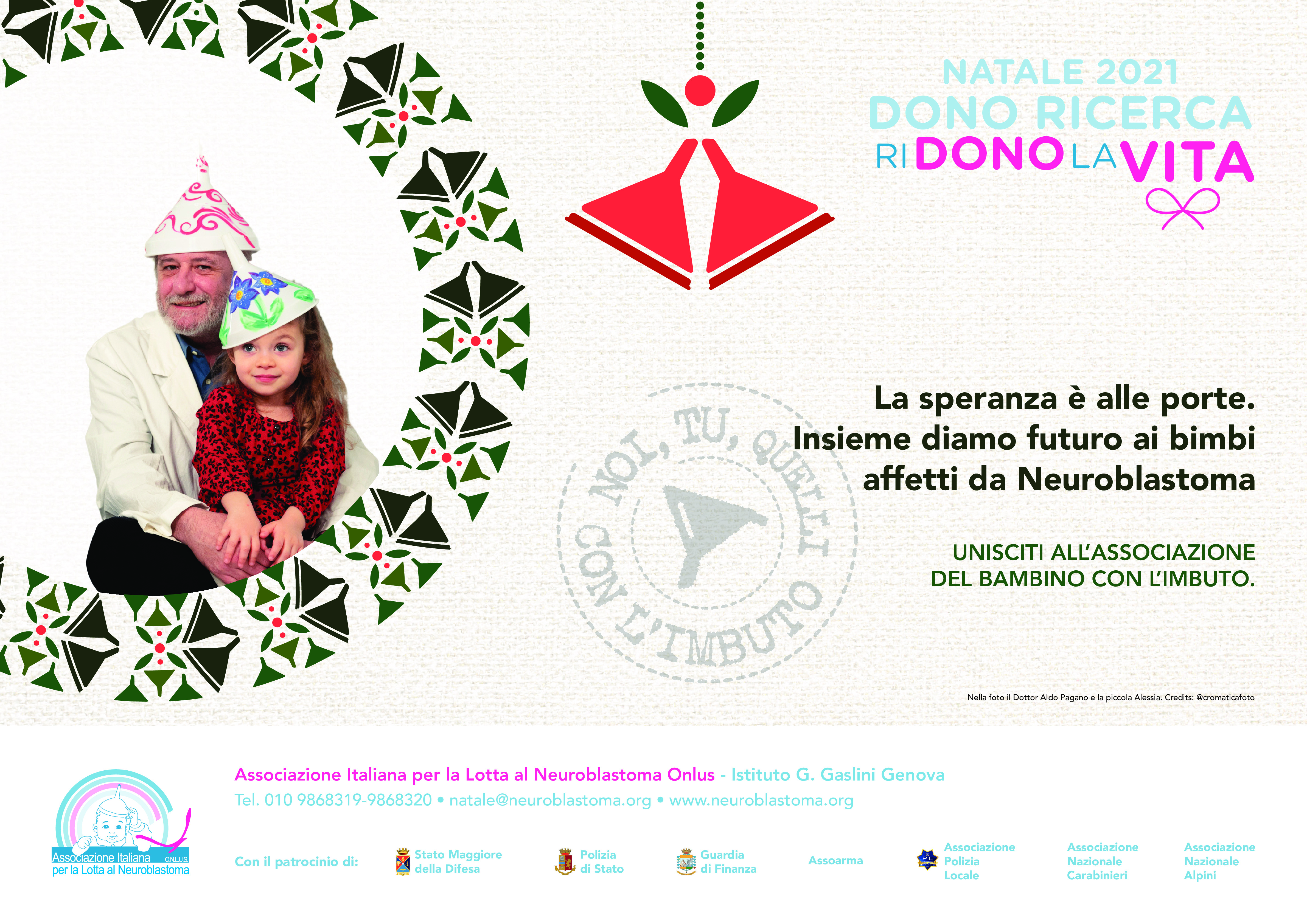 In quasi trent'anni di attività, l'Associazione Italiana per la Lotta al Neuroblastoma si muove per dare sostegno concreto al lavoro di ricercatrici e ricercatori. Un impegno reso forte da sostenitrici e sostenitori sparsi in tutta Italia e dalle realtà istituzionali pronte a offrire il patrocinio morale per manifestare coi loro loghi fiducia verso iniziative come ad esempio la campagna di Natale. Una campagna, quella di quest'anno, patrocinata da Assoarma, Associazione Nazionale Alpini, Associazione Nazionale Carabinieri, Associazione Polizia Locale, Guardia di Finanza, Polizia di Stato, Stato Maggiore della Difesa.