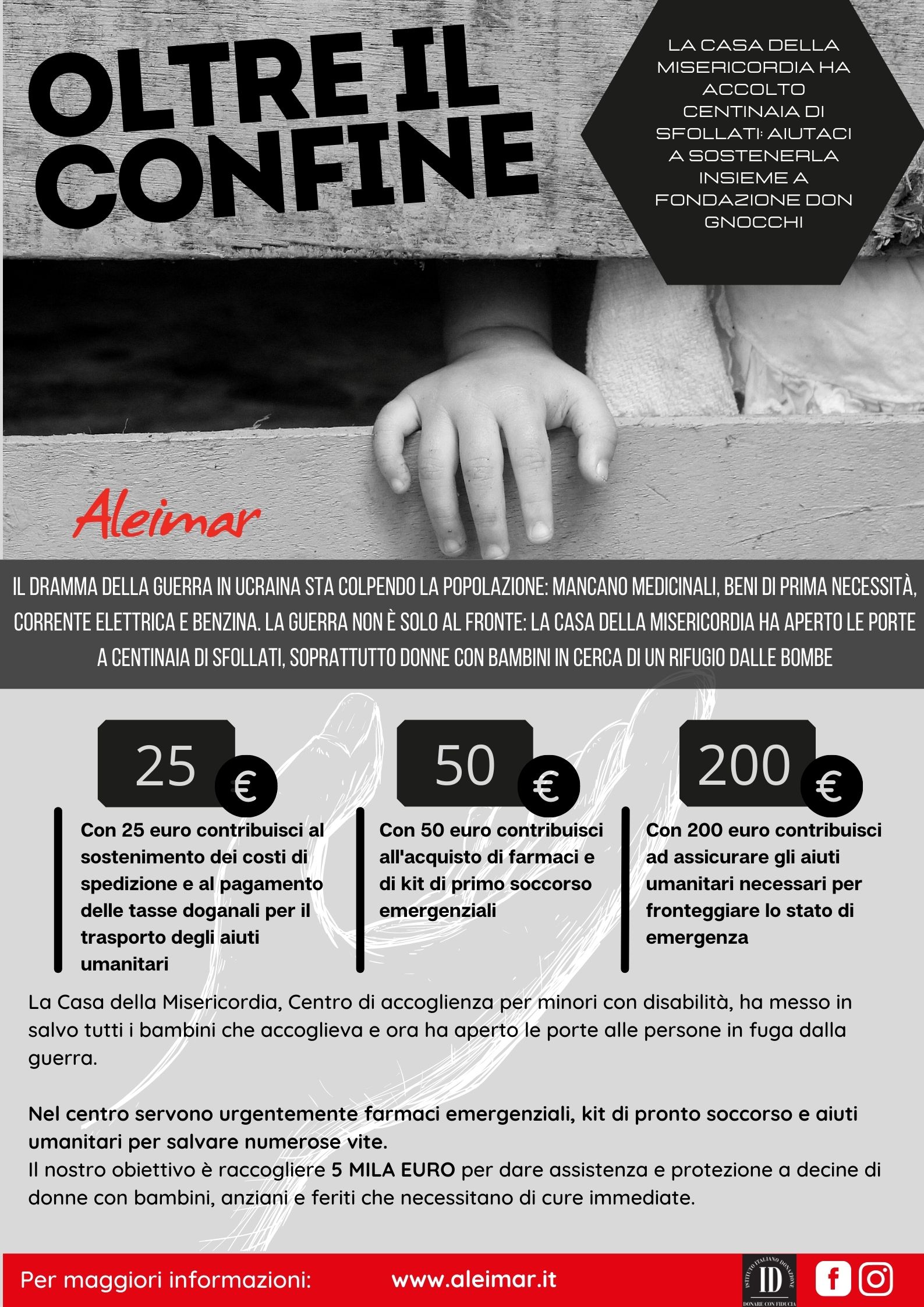 La guerra con la sua brutalità ha colpito il paese dove è in atto una vera e propria emergenza umanitaria. Insieme alla Fondazione Don Gnocchi, Aleimar OdV ha deciso di sostenere la Casa della Misericordia, un centro di accoglienza per minori con disabilità che ospita e assiste circa 100 bambini disabili.