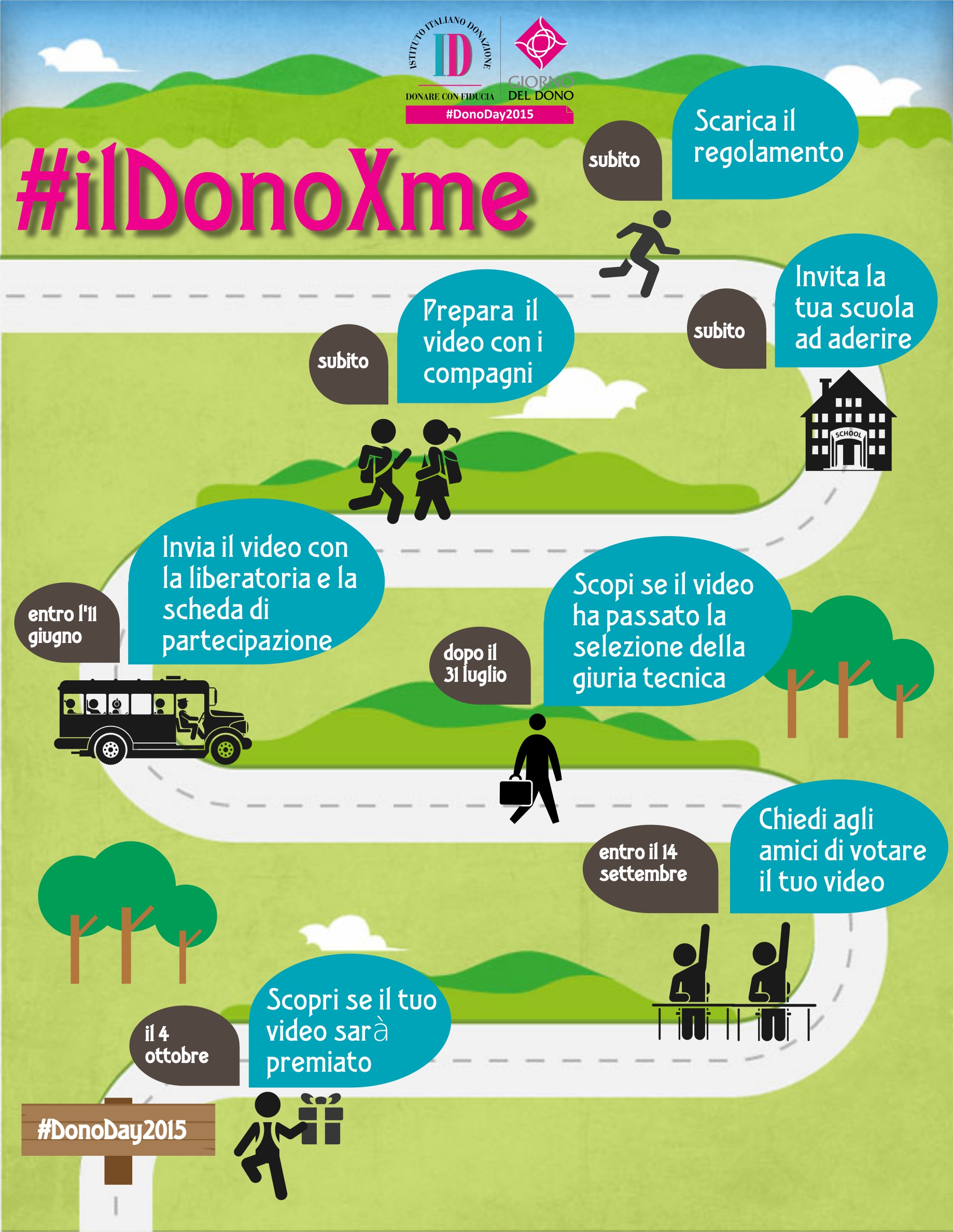 Scarica il regolamento che trovi qui a fianco per avere tutte le informazioni e poi invita la tua scuola ad aderire al progetto GIORNO DEL DONO, sarai ricontattato per ricevere maggiori informazioni. Per qualsiasi chiarimento scrivici a comunicazione@istitutoitalianodonazione.it.